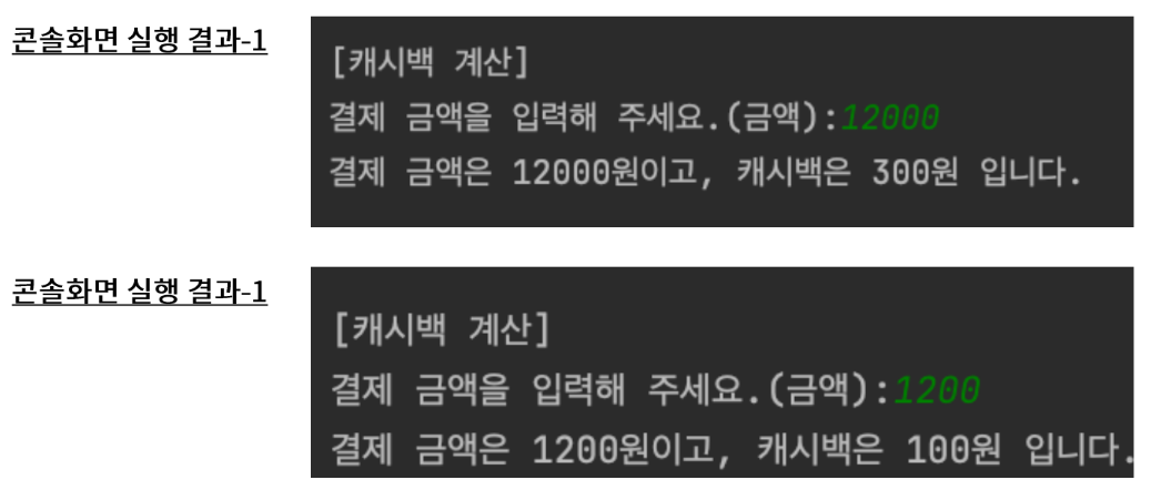- 수행 목적 : Scanner의 입력함수와 조건문을 통한 캐시백 계산 로직 작성