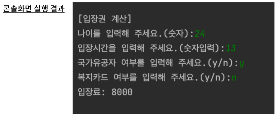 - 수행 목적 : Scanner의 입력함수와 다중 조건문을 통한 입장권 계산 로직 작성
