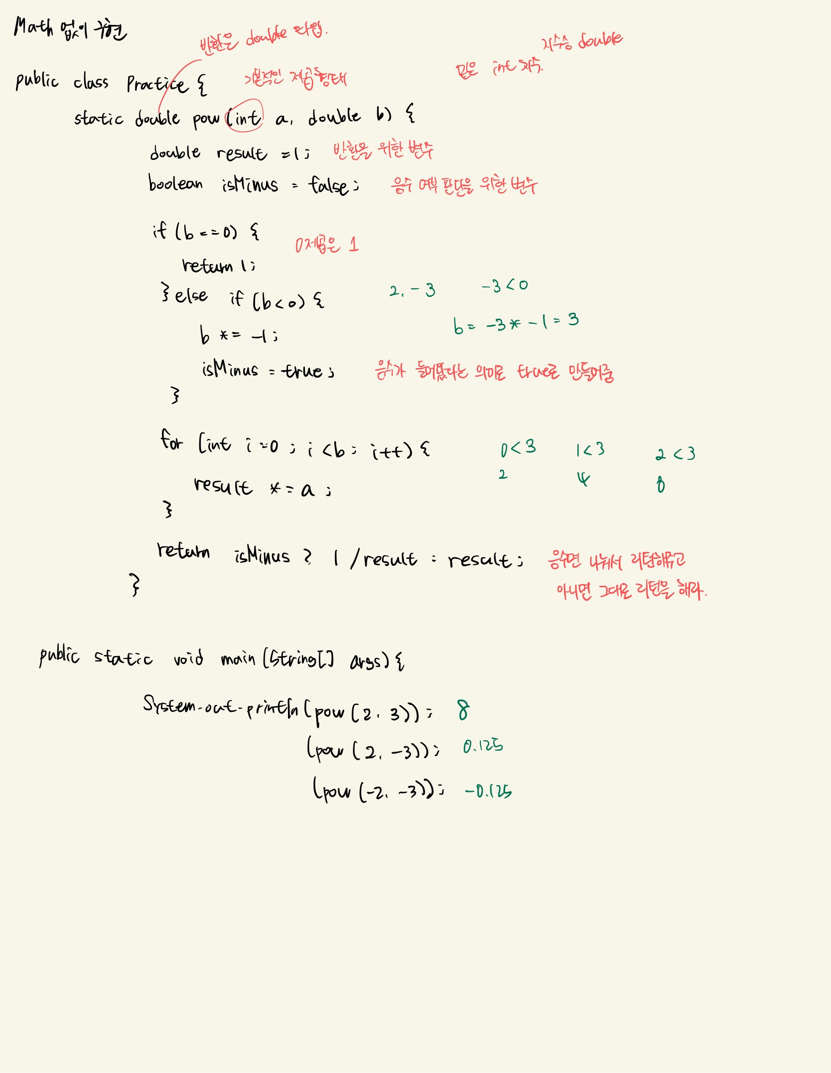 // 반환은 double 타입으로 밑은 int 지수 승은 double 형태로 받도록 만듬
