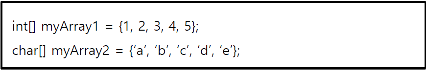 char[] myArray2 = {'a', 'b', 'c', 'd', 'e'};
